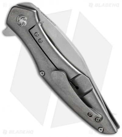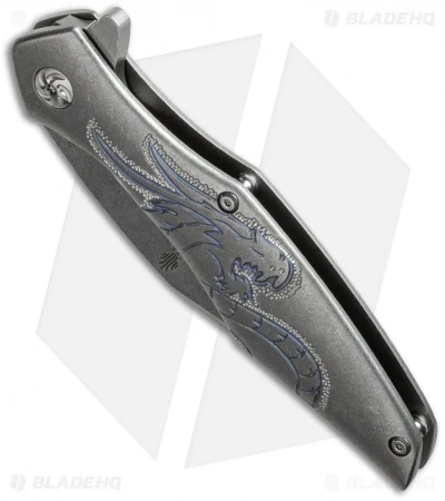 The Kizer Trifecta has a large recurved drop point blade with hollow grinds and a swedge spine. Its flipper works in tandem with the ceramic ball-bearing pivot to enable quick one-hand opening. The rounded, tumbled titanium handle slabs are separated by two barrel spacers and the frame lock tab is outfitted with a steel lock insert. Fitting for a knife of the Trifecta’s caliber, is a milled titanium clip. This model has an embellished handle featuring a machined, blue anodized dragon with stippled flare.