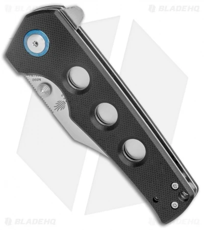 - Black G-10 skeletonized handle with a stainless steel liner.