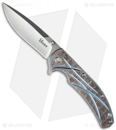 Lightweight and sleek, this classy folder features a stonewash, S35VN stainless steel, clip point blade, ambidextrous thumb studs, and an anodized, right hand, tip-down pocket clip. This titanium folding knife from Kizer Cutlery is elegant to look at and has smooth action. The 6Al4V Titanium handle has a blue anodized finish and uses the frame lock construction for secure blade lock up.