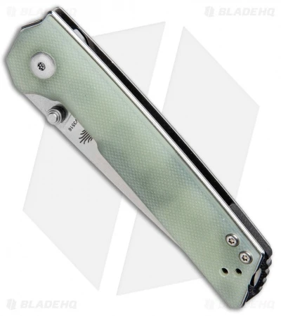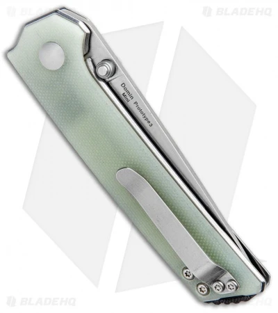 This Domin Mini model is built with a stonewashed blade and a green jade G-10 handle. The blade opens using bronze washers.